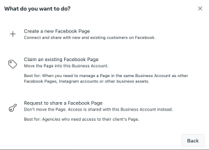 - A pop-up will appear -> click “Claim an existing Facebook Page”
